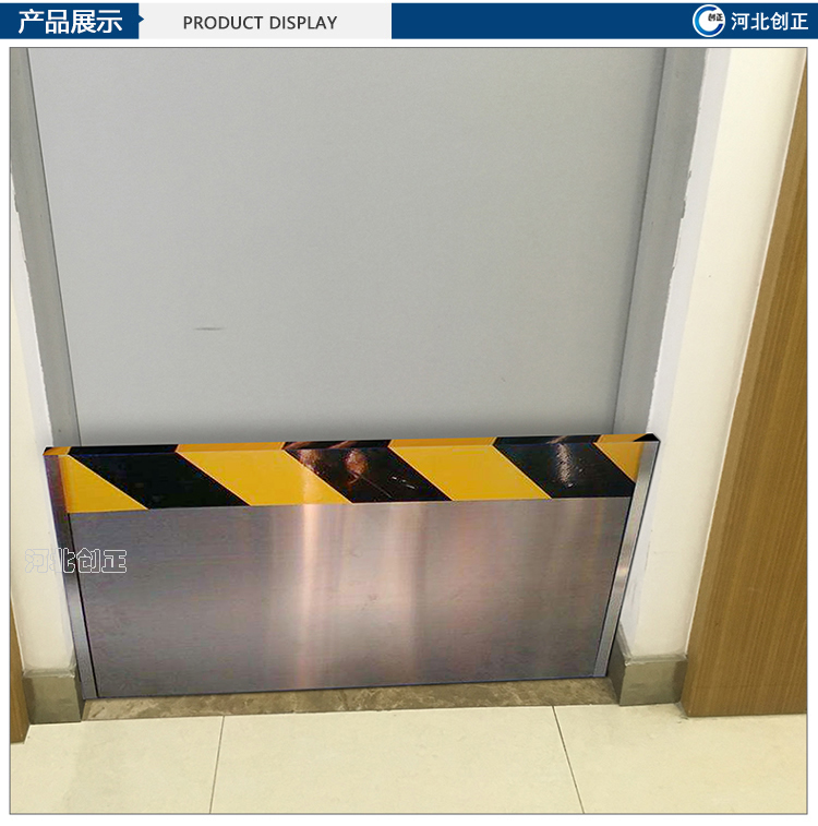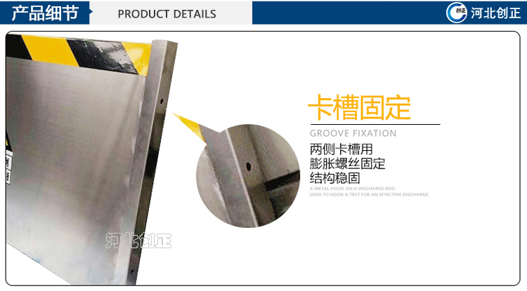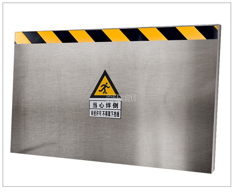 不銹鋼擋鼠板采用不銹鋼板材制做。擋鼠板上部貼黃黑相間反光條,反光條為反光膜加背膠紙制作。