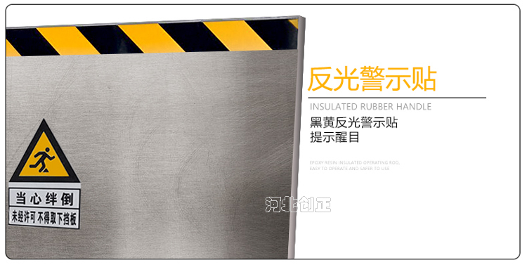不銹鋼擋鼠板表面經防腐處理。擋板上部貼有黃黑相間的反光條,起到警示作用。